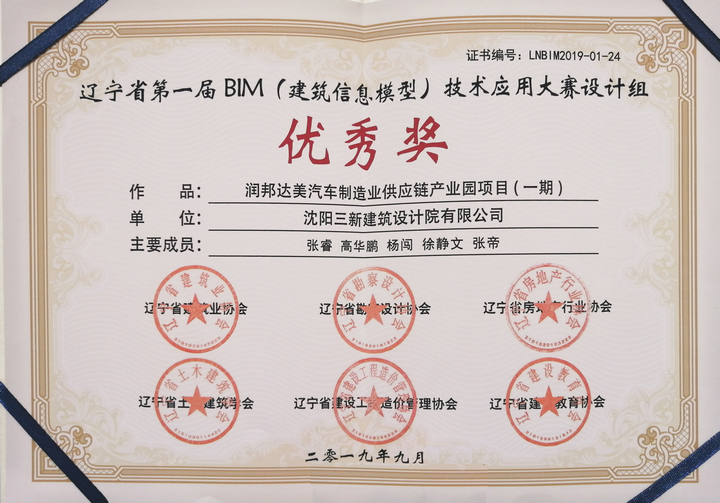 2019年10月18日,“遼寧省第一屆BIM(建筑信息模型)技術(shù)應(yīng)用大賽”召開了頒獎(jiǎng)大會(huì),頒發(fā)獎(jiǎng)牌及榮譽(yù)證書。我公司由張睿、高華鵬、楊闖、徐敬文、張帝組成的BIM團(tuán)隊(duì)提交的參賽項(xiàng)目《潤(rùn)邦達(dá)美汽車制造業(yè)供應(yīng)鏈產(chǎn)業(yè)園項(xiàng)目(一期)》斬獲遼大賽優(yōu)秀獎(jiǎng)。