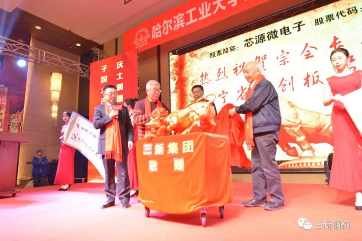 本屆校友會的承辦方,沈陽三新集團(tuán)總經(jīng)理,校友會副會長,本屆年會籌備組組長洪長禧先生代表沈陽校友特為宗會長及芯源微電子贈送銅牛一尊!祝芯源微電子財(cái)源廣進(jìn),牛市長紅!