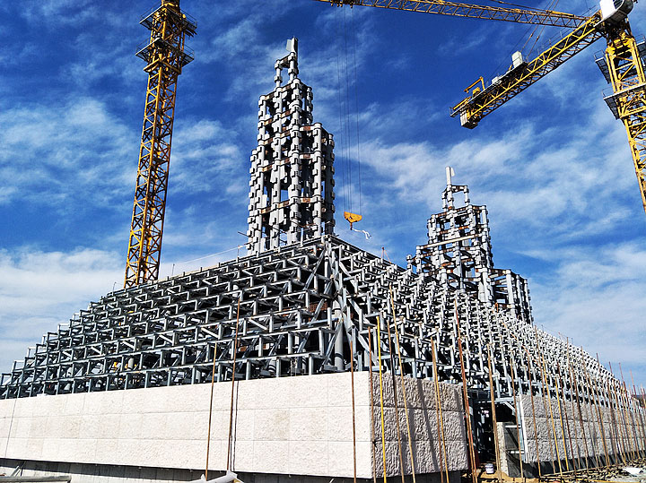 黃帝問道大項目是“帝師之鄉(xiāng)”汝州的重點大型城雕項目,也是當?shù)氐貥诵越ㄖ?。該項目肩負著弘揚汝州歷史文化和華夏文明的重任,承載了太多榮耀和希冀。雕像基底面積1400平方米,人像總高度59.8米,主體結構采用圓管鋼框架,外側采用干掛石材雕塑,總用鋼量2300噸,設計使用年限為100年。雕塑內(nèi)部水、電、消防配套齊全。要用鋼結構、石塑傳神地塑造中華民族敬為人皇的黃帝雕像,不失神韻和靈氣,其難度可想而知。三新不負重托,攻克所有的技術難題,把大師畫卷中的意象用建筑語言完美呈現(xiàn),體現(xiàn)了三新建筑技術與藝術完美融合的建筑理念。施工過程中汝州市政府各級領導多次到現(xiàn)場檢查指導,對工程質(zhì)量贊賞有加。我們一起見證了精品的煉成,其中凝聚了三新人的心血和智慧,更體現(xiàn)了三新的創(chuàng)新精神。如今被評為“中國鋼結構金獎”工程,更是實至名歸。三新帶您一睹黃帝風采,領略華夏文明。