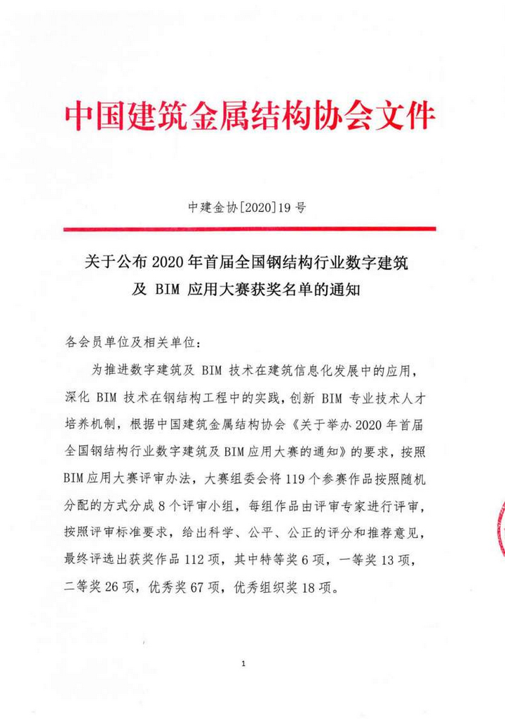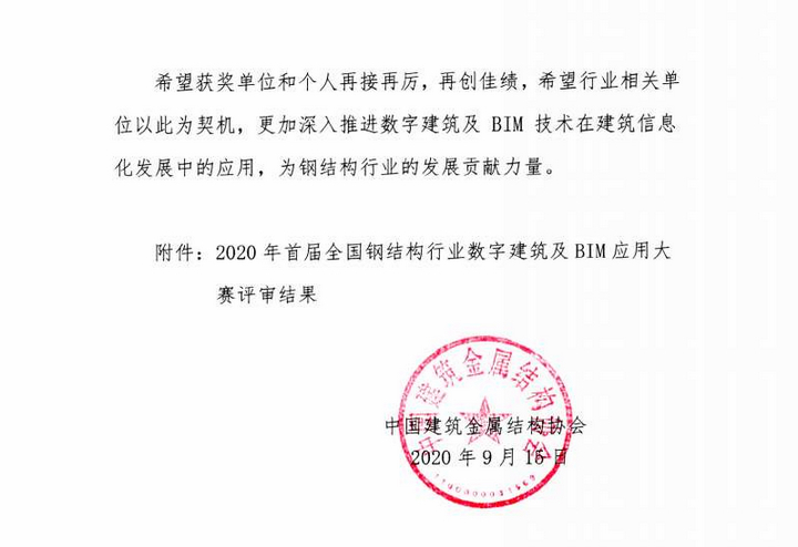 本次大賽由中國建筑金屬結(jié)構(gòu)協(xié)會鋼結(jié)構(gòu)分會承辦,旨在推進數(shù)字建筑及BIM技術(shù)在建筑信息化發(fā)展中的應用,深化BIM技術(shù)在鋼結(jié)構(gòu)工程中的實踐,創(chuàng)新BIM專業(yè)技術(shù)人才培養(yǎng)機制。大賽對于提高我國建筑業(yè)建筑信息模型技術(shù)的應用水平,實現(xiàn)真正意義上轉(zhuǎn)型升級,提升工程質(zhì)量和效率、降低造價和節(jié)約資源,推動技術(shù)創(chuàng)新、質(zhì)量創(chuàng)優(yōu)和人才隊伍建設(shè)有著積極的推進作用。同時相信隨著BIM應用的進一步展開,我公司的裝配式建筑發(fā)展將如虎添翼,我司 BIM團隊會取得更加優(yōu)異的成績!