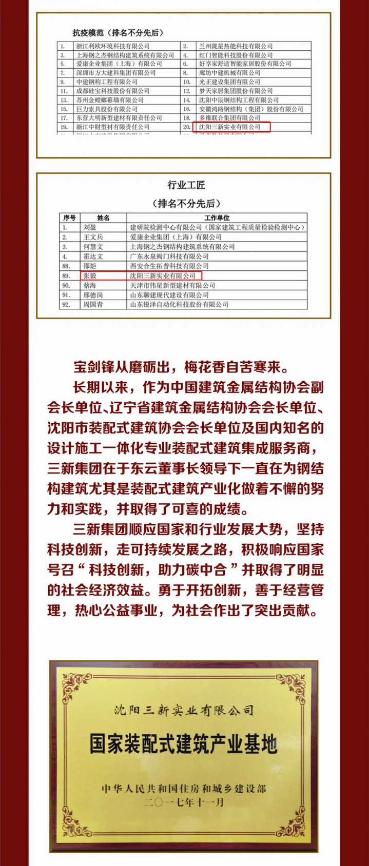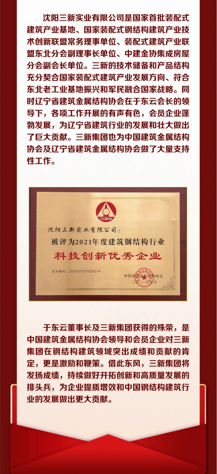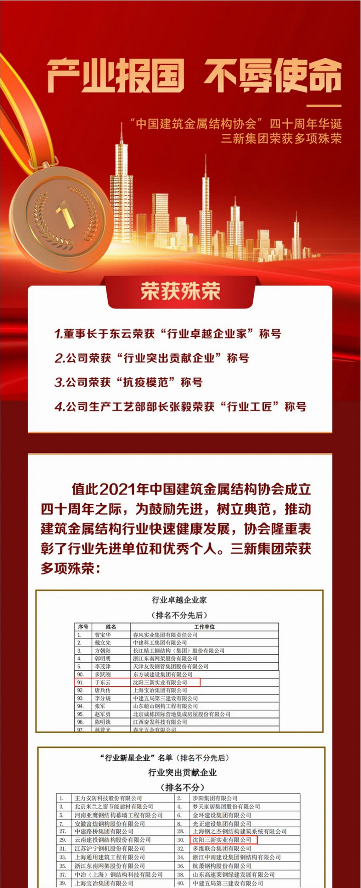 產業(yè)報國 不辱使命——“中國建筑金屬結構協(xié)會”四十周年華誕,三新集團榮獲多項殊榮