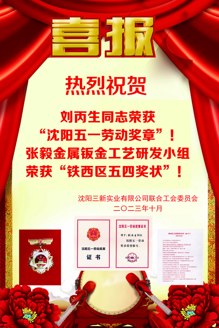 熱烈祝賀 劉丙生同志榮獲“沈陽(yáng)五一勞動(dòng)獎(jiǎng)?wù)隆保?張毅金屬鈑金工藝研發(fā)小組榮獲“鐵西區(qū)五四獎(jiǎng)狀”!