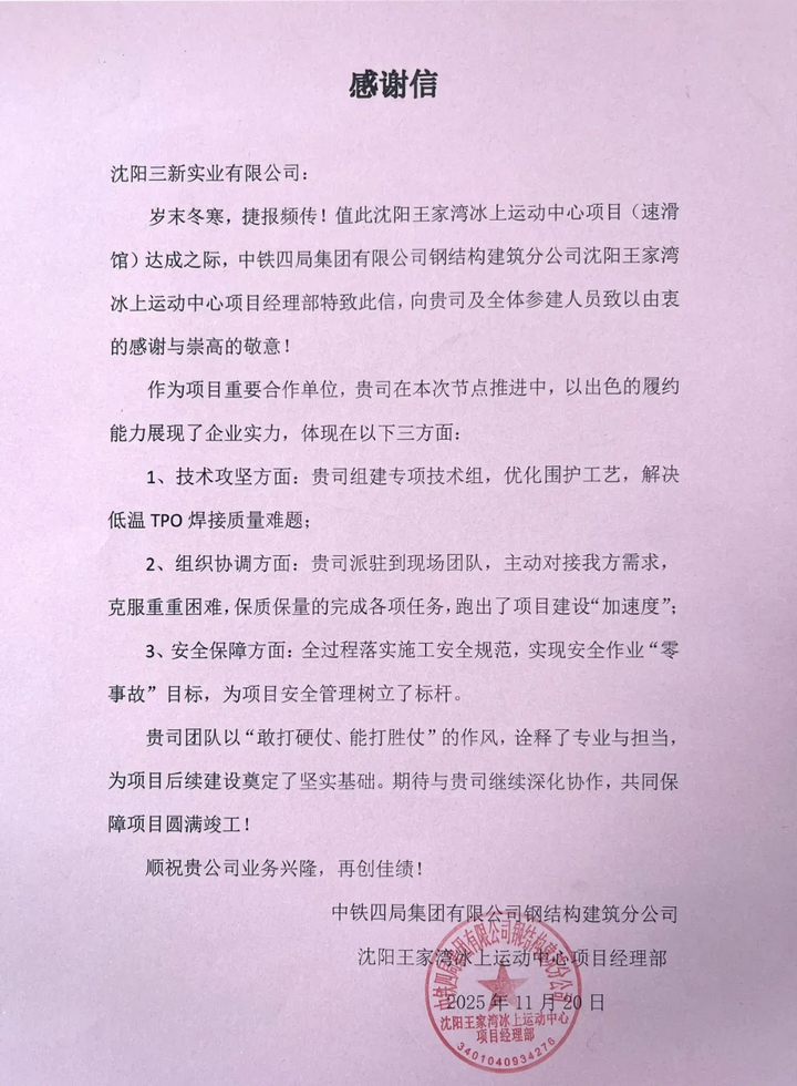日前,中鐵四局項目部的感謝信跨越金秋而來,字里行間滿是對三新的敬意:“技術(shù)攻堅破局、組織協(xié)調(diào)高效、安全保障扎實,以‘三新力量’為場館如期封閉筑牢根基。”這紙贊譽背后,是汗水與堅守的沉淀,更是對東北建筑鐵軍匠心與實力的最佳詮釋。