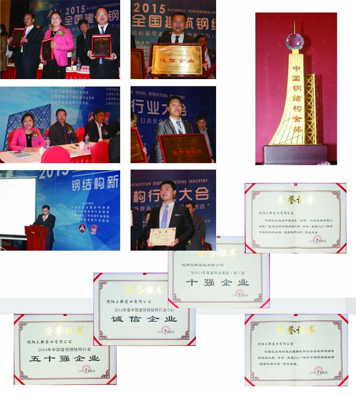 本屆大會是表彰盛會,它被譽為鋼結構行業(yè)的“東方奧斯卡盛典”共有十二個獎項在此頒發(fā)。三新集團董事長兼遼寧省建筑金屬結構協(xié)會會長于東云率團參加了本次大會,并做了主旨演講。公司工程部高剛部長在“鋼結構新技術、新產品交流會”上介紹并展示了公司的新技術新產品。公司承建的中國有色(沈陽)冶金機械新廠區(qū)建設項目、中鋁集團東北輕合金有限責任公司超大規(guī)模特種鋁合金板帶材項目及優(yōu)化特種鋁合金板帶材產品結構配套項目分獲第十一屆第二批“中國鋼結構金獎”。同時公司還獲得2014年度“中國建筑鋼結構誠信企業(yè)(5A)”企業(yè)、“2014年度全國鋼結構行業(yè)50強企業(yè)”、“2014年度金屬屋墻面行業(yè)十強企業(yè)” 稱號,于東云董事長榮獲“2014年度全國鋼結構行業(yè)優(yōu)秀企業(yè)家” 稱號、王國臣榮獲 “2014年度全國鋼結構行業(yè)優(yōu)秀車間主任”稱號、吳龍榮獲“2014年度行業(yè)協(xié)會優(yōu)秀工作者” 稱號。公司還派團參加了“2015年鋼結構龍頭企業(yè)業(yè)績及配套產品展覽會”,公司及產品得到參會客商的良好評價。