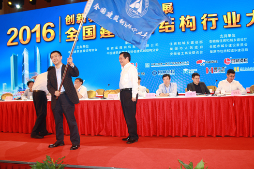 最后,安徽富煌鋼構(gòu)股份有限公司董事長楊俊斌將象征著年會承辦權的會旗交到2017年的承辦單位沈陽三新實業(yè)有限公司總經(jīng)理洪長禧手中,我們明年沈陽再聚首!