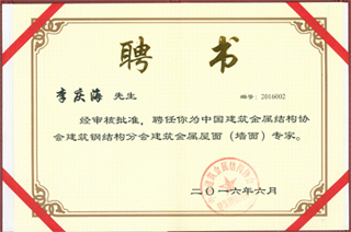 近日獲悉,我公司總工程師李慶海被聘為中國建筑金屬結(jié)構(gòu)協(xié)會(huì)鋼結(jié)構(gòu)分會(huì)建筑金屬墻面(屋面)專家。